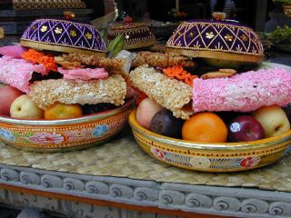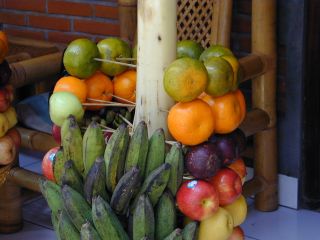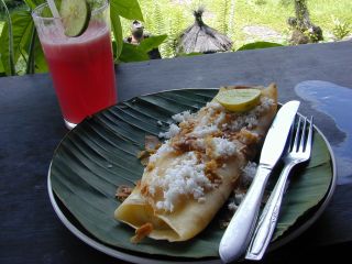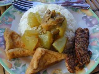 1月13日(月) 朝、ナシチャンプルーを食べる。昼は、みんなでWarun Catuにてご飯を食べる。私は今回もナシチャンプルー。夜は、水底とふたりでパダン屋に行き、そこで食べる。テンペと鶏のカレー煮。美味。 食:8時、ナシチャンプルー、フルーツサラダ。 食:12時、ナシチャンプルー、スイカジュース(Warun Catu) 食:19時、パダンご飯、エステ 1月14日(火) 数日前から、ステイ先の家では15日に向かって家の寺の祭りの準備に忙しい。集落の寺のお祭りもあるのでいつもよりも倍忙しいようである。本日は早朝より男達が料理をする。そこで起き出して、鶏をもも肉から包丁でたたいてミンチにしたり、茹でた豚の顔を刻んだり、野菜を刻んだり、鶏をしめて血を抜いて伝統的な血を混ぜたサラダのラワールメラをつくったり、トゥムと呼ばれる肉と野菜の蒸しもののようなものをつくったりするのを見物する。朝の5時からずっと料理をしていた。そして、朝は遅めで、このラワールを食べさせてもらう。昼は、トゥムや鶏の煮たのをいただく。夜は、水底とナシチャンプルーを食べに行く。先日水底母と行ったところ。本日のは実に辛かったがやはりテンペがおいしかった。水底も気に入る。 食:9時、ナシチャンプルー、フルーツサラダ 食:14時、ナシチャンプルー、フルーツサラダ 食:20時、ナシチャンプルー、エステ(無名)