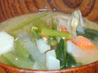 | ほうれん草と豚バラの出会い | 味噌汁は具だくさんで |