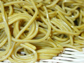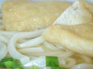 | 油揚げをのせたうどん。ほうっとする味 | だったんそば。微妙な色 |